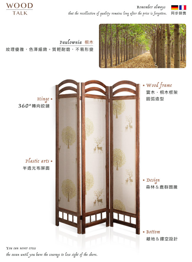 【C'est Chic】秘鹿漫步三片創意實木屏風。藝術品味,德國、法國與歐洲同步。一般陳設於室内的顯著位置,分隔、美化、擋風、協調等作用。它與傢俱相互輝映,相得益彰,渾然一體,成為家居裝飾不可分割的整體,而呈現出一種和諧之美、寧靜之美。桐木框架屏風,實木質感,透過嫻熟老師傅的多年工藝,木匠手作,演繹出古典、復古、創新的歐式風格,宛如跳動的音符,演奏輕鬆愉悅的樂章,譜寫愜意的生活心情。