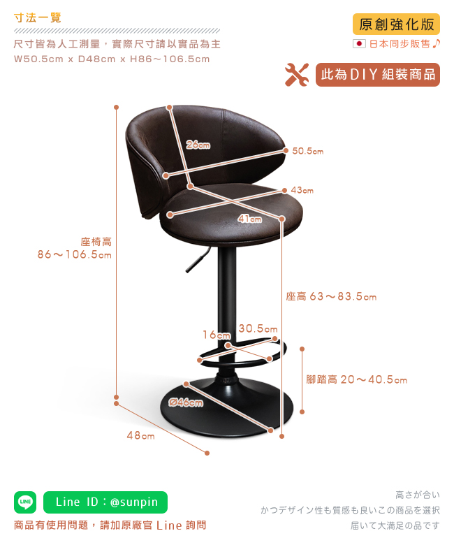 產品尺寸:W50.5*D48*H86~106.5 cm / SH63~85 cm