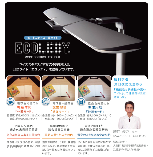 1965年,KOIZUMI照明事業正式開始。歷經半個世紀的改進與研發,開發出適合休閒/念書/專注的三種光色模式。腦科學家・澤口俊之先生推薦,多功能的KOIZUMILED智慧護眼燈具,對於保護眼睛、孩子的大腦成長發育,有極大的幫助。