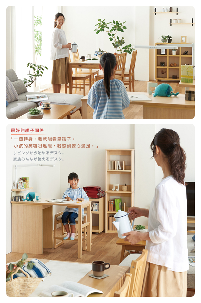一致的溫暖色調、風格,呈現原木的天然之美。您可以選配書桌、桌上架、收納櫃、書櫃、學童椅,對應您屋內的格局,佈置成專屬於孩子的單人/雙人書桌組。我們希望親子能自然而然坐在一起,沒有距離感,所以設計了旋轉書桌、雙人學習椅,慢慢累積親子相處的陪讀時光,讓這小小的片刻,成為永遠都會記得的幸福。
