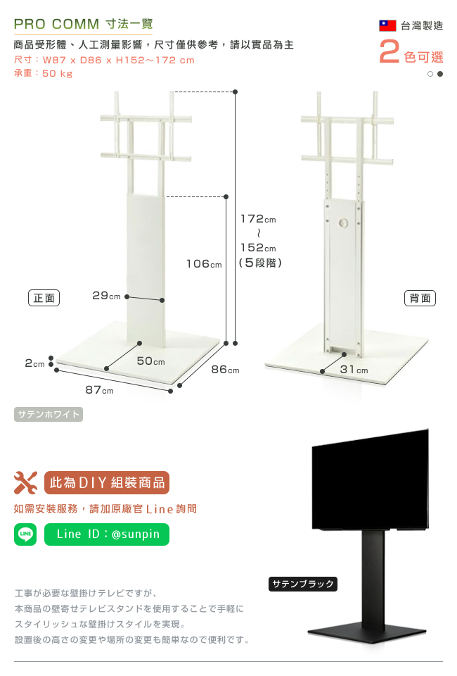 依個人視角習慣,可微調電視高度,擁有最舒適的觀影體驗。使用鋼結構,最高承重 50kg。並且日本試驗在震度 7 的情況下,相對於一般電視的擺放方式,更不易傾倒。因此可在任何場所佈置,如房間、客廳、廚房或商務空間。電視立架背面,可裝入延長線,讓電線井然有序。背板藏線設計,美化居家的空間。大片鋼製底座與防滑設計,強化抓地力與耐荷重,不易滑動,牢固穩定。