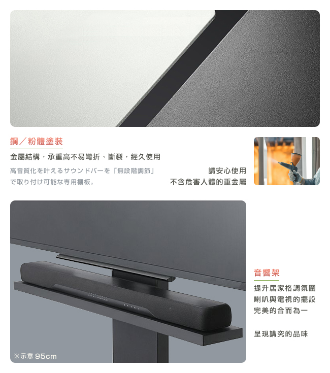 提升大電視觀影體驗的喇叭,該如何擺設,才能呈現出高音質的饗宴呢?依自己的喜好,無段式調整高度的 R3 專用層板架,讓聲波與您保持水平,環繞效果更具深度,並提升居家質感氛圍,讓電視不再枯燥乏味,而是獨特品味。使用鋼結構,最高承重 10kg,堅固耐久,放心擺設專業喇叭。