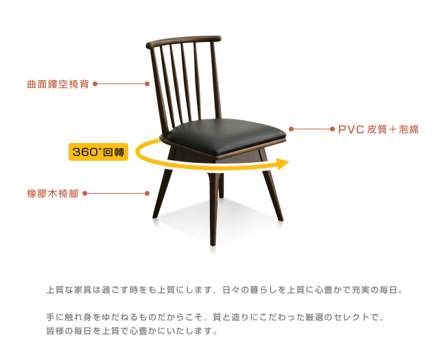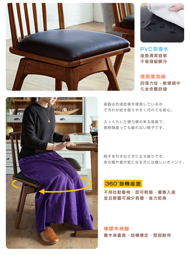 奢華使用橡膠木做餐椅,讓每一次用餐,都是饗宴。即使是讀書、辦公,或喝杯咖啡閒話家常,這充滿魅力品味的餐桌椅,將令人印象深刻。360 度旋轉座面,不用拉動餐椅,即可輕鬆、優雅入座,並且膝蓋可減少負擔,省力起身。PVC 防潑水,座墊清潔容易,不易殘留髒污。橡膠木椅腳,實木承重高、結構穩定,堅固耐用。