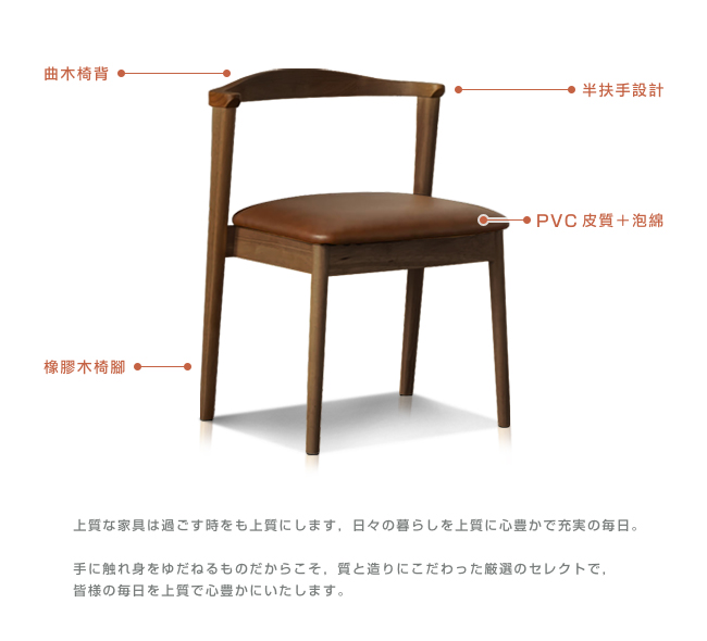 材質:椅背:榿木、椅框與椅腳:橡膠木、PVC、泡綿