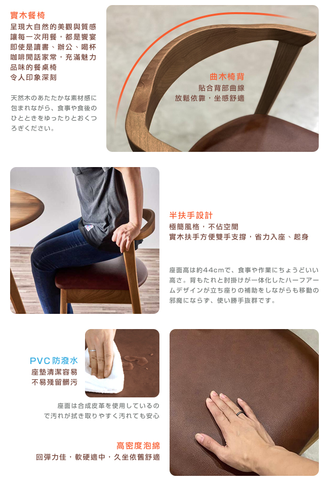 奢華使用榿木/橡膠木做餐椅,讓每一次用餐,都是饗宴。即使是讀書、辦公,或喝杯咖啡閒話家常,這充滿魅力品味的餐桌椅,將令人印象深刻。曲木椅背,貼合背部曲線,放鬆依靠,坐感舒適。半扶手設計,極簡風格,不佔空間。實木扶手方便雙手支撐,省力入座、起身。PVC 防潑水,座墊清潔容易,不易殘留髒污。橡膠木椅腳,實木承重高、結構穩定,堅固耐用。