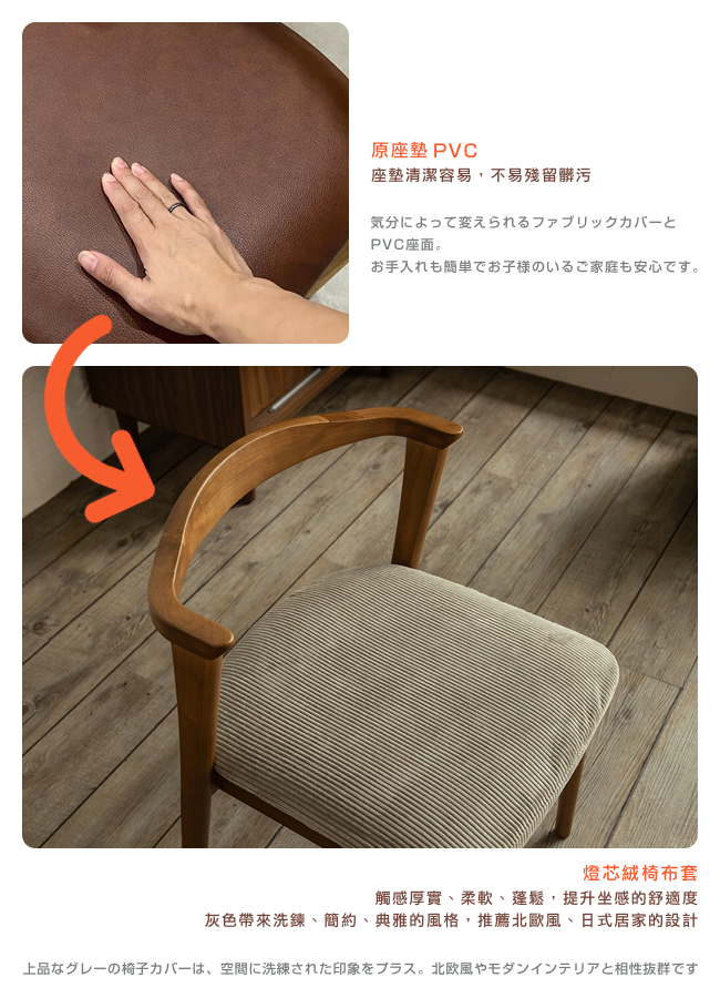 燈芯絨椅布套,觸感柔軟蓬鬆,外觀溫暖優雅,顏色會隨著光源的角度而變化,增添空間時尚的美感。灰色帶來洗鍊、簡約的風格,推薦北歐風、日式居家的設計。