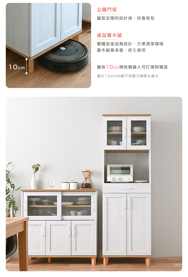 【Sato】日本家具品牌,職人專業工藝,講究獨特的細緻、追求質感的細節,完美演繹,優美居家的生活空間。小倉家具系列的特色之一,木紋天板帶來溫暖的感受,提升空間的質感。石紋玻璃仿若古歐洲的石板道路,簡約中點綴藝術氛圍。金屬復古把手,古典設計,增添品味,好抓握開關順手。並附黑、白雙色,可依喜好來選擇安裝。可動層板 4 個,依物品大小調整位置,活用空間。開放置物格深度 35.4cm,可放小烤爐、咖啡機、微波爐等。滾輪式滑軌抽屜,好推好拉,開關順暢自如,方便收納。美背設計,細膩別緻的質感。櫃體底座加高設計,方便清潔環境。實木腳高承重,經久使用。離地 10cm,掃地機器人可打掃到櫃底。