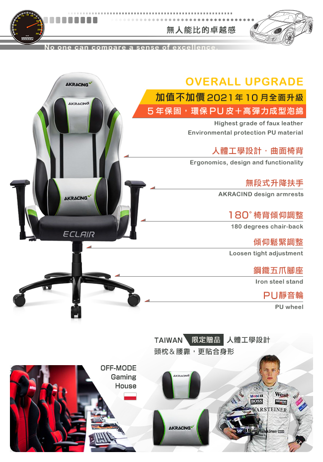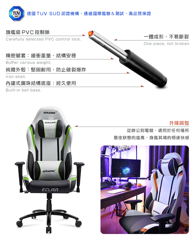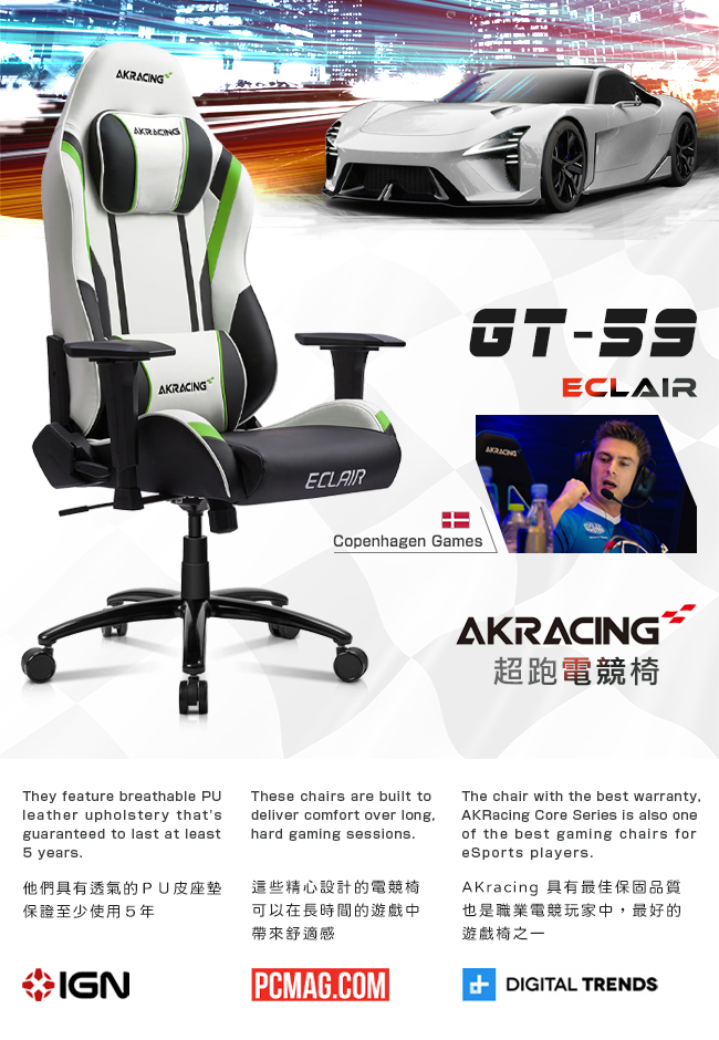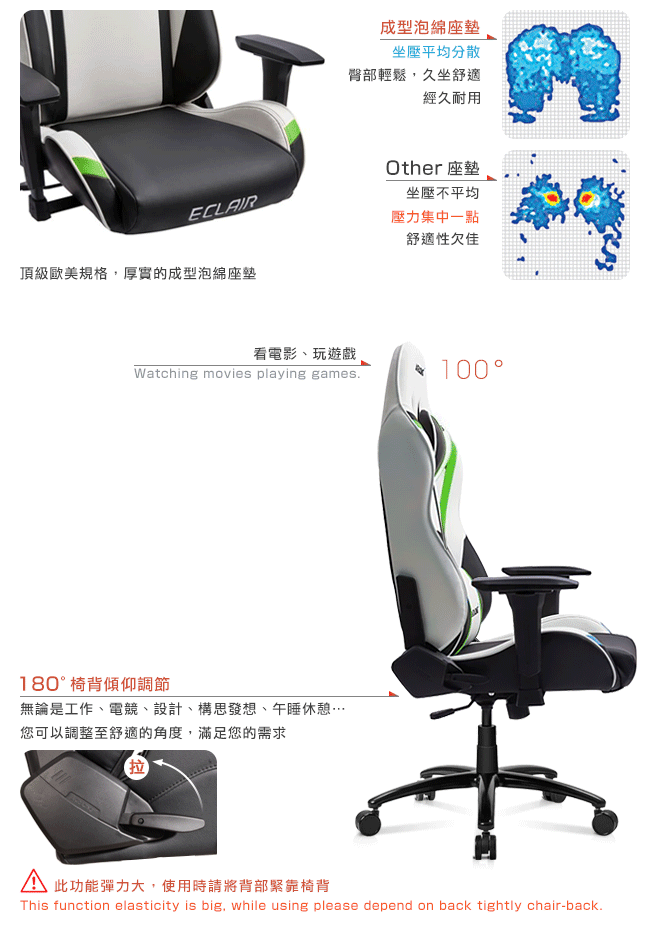通過國際 SGS、德國 TUV SUD 安全認證。外銷歐美、日韓、亞洲、南美、紐澳等 40 餘國,廣受專業人士的歡迎,更是各國職業電競賽事的專用座椅。搭配人體工學、頂級環保 PU 皮、高彈力成型泡綿,讓人體和座面之間,緊密貼合在一起。完美的包覆感,分散壓力,久坐不累,達到放鬆的效果。