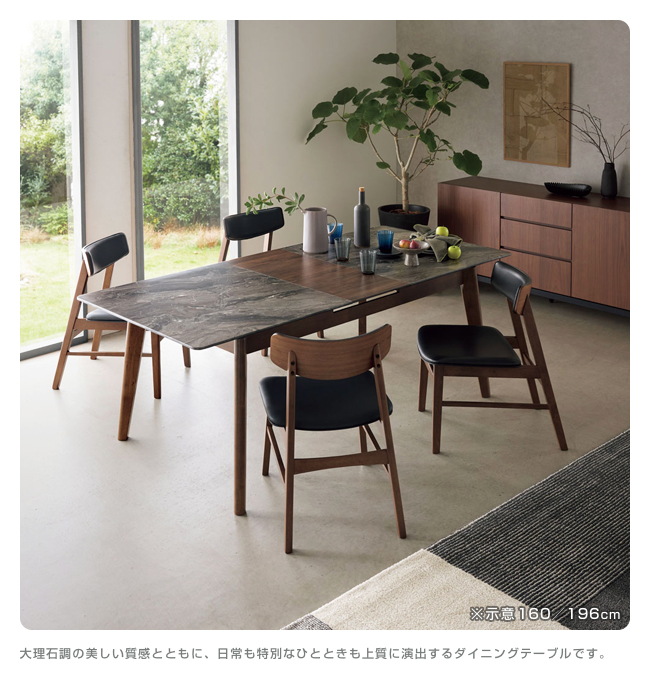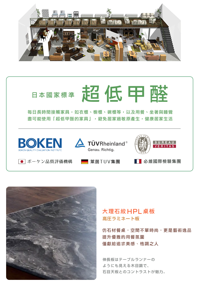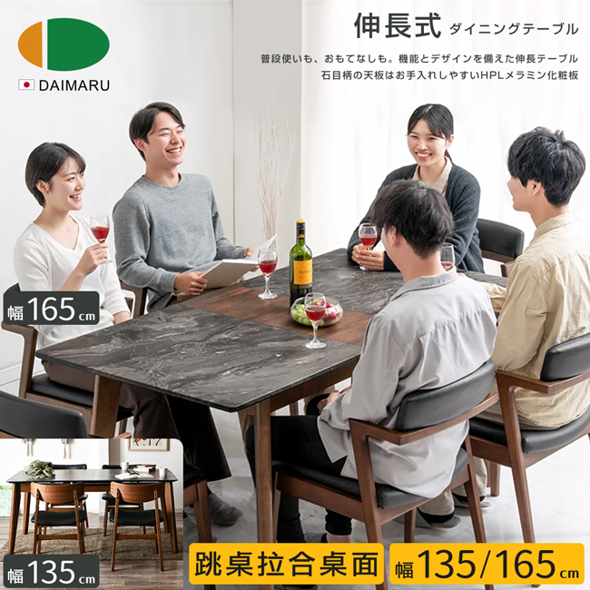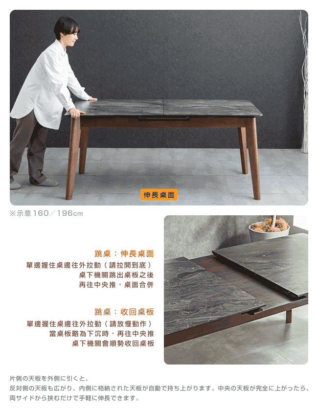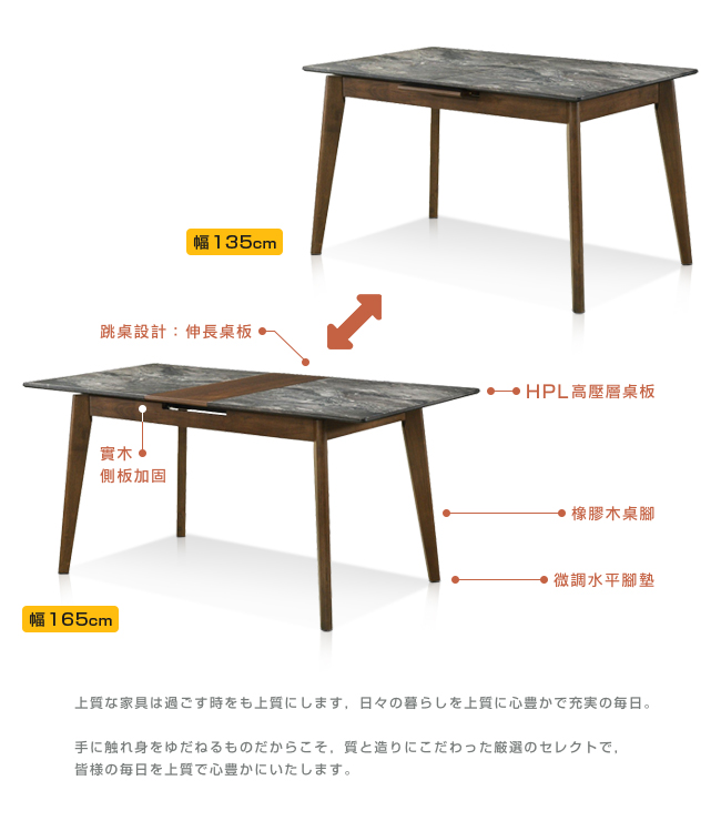 奢華使用仿大理石紋餐桌,讓每一次用餐,都是饗宴。即使是讀書、辦公,或喝杯咖啡閒話家常,這充滿魅力品味的餐桌,將令人印象深刻。HPL 高壓層壓板桌面,有很好的抗磨、耐刮的特性,還能防止食物殘渣與油漬侵蝕桌面,不易褪色,經久使用。極佳的耐熱性,熱鍋可短暫放於桌上。單邊握住桌邊往外拉動,即可伸長桌面,增加用餐空間。邊角&側板實木加固,增加承重力與桌板穩定度,堅固耐用。橡膠木桌腳,實木結實穩固,安穩無虞。微梯形設計,視覺與結構四平八穩,穩如泰山。因應地面環境,微調水平腳墊,讓桌面不晃動,且可避免刮傷木質地板、磁磚。