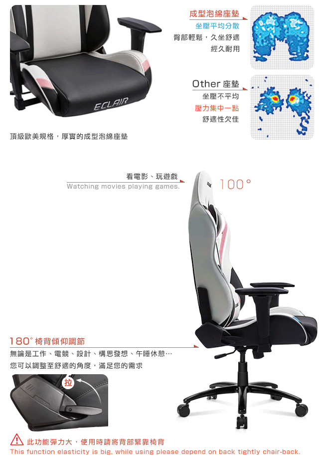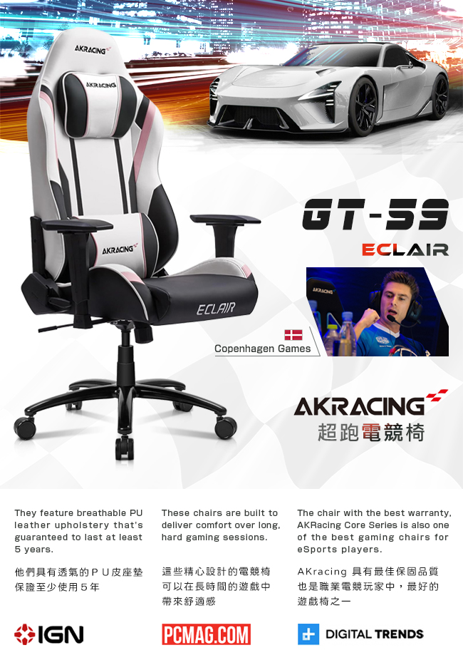 通過國際 SGS、德國 TUV SUD 安全認證。外銷歐美、日韓、亞洲、南美、紐澳等 40 餘國,廣受專業人士的歡迎,更是各國職業電競賽事的專用座椅。搭配人體工學、頂級環保 PU 皮、高彈力成型泡綿,讓人體和座面之間,緊密貼合在一起。完美的包覆感,分散壓力,久坐不累,達到放鬆的效果。