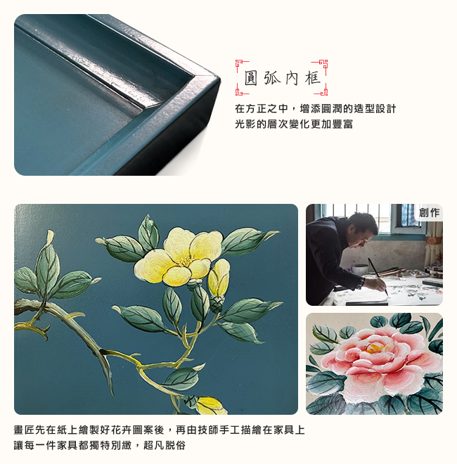 手繪花卉層層暈染,筆觸細膩自然,花姿嫻雅,綻放古典之美。「人閒桂花落,夜靜春山空」帶有詩意的茶盤,飲盡人生品味。畫匠先在紙上繪製好花卉圖案後,再由技師手工描繪在家具上,讓每一件家具都獨特別緻,超凡脫俗。