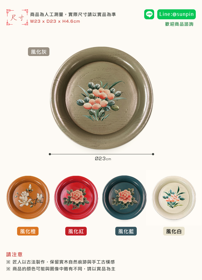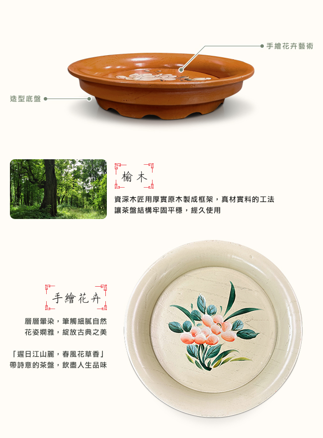 手繪花卉層層暈染,筆觸細膩自然,花姿嫻雅,綻放古典之美。「遲日江山麗,春風花草香」帶有詩意的茶盤,飲盡人生品味。畫匠先在紙上繪製好花卉圖案後,再由技師手工描繪在家具上,讓每一件家具都獨特別緻,超凡脫俗。造型底盤,盤面墊高,分段腳座不易泡水,濕氣易散,厚底座重量安定,不易滑動。