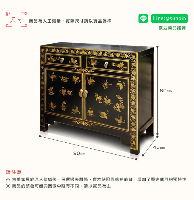 墨黑為底,手工描繪金邊花卉,視覺構成精簡卻有層次的美感,典雅內斂,品味脫俗。蝴蝶常見於古中國的繪畫作品,音似「福」、「瓞」,寓意祝福、福氣,與綿綿瓜瓞的意涵。古色古香的置物櫃中,讓收納不由得帶些文藝氣息。