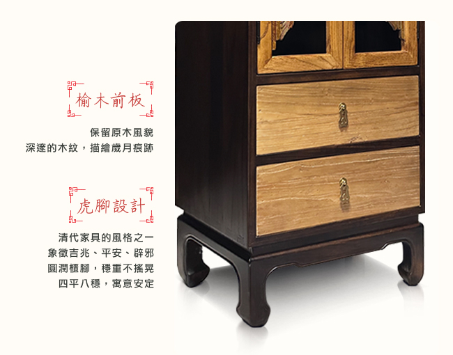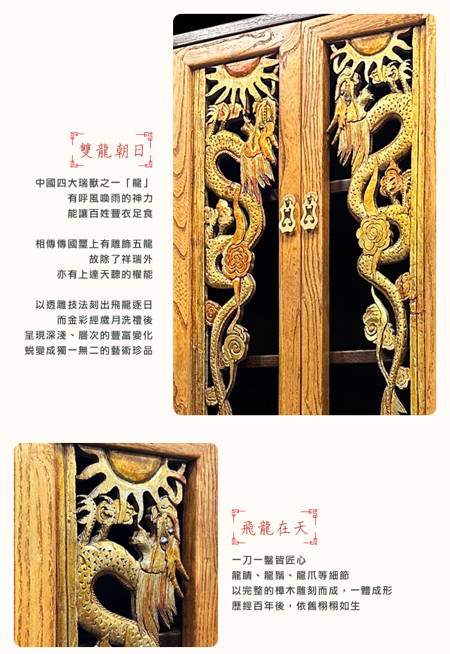 雙龍朝日的古法手工雕板,將中國四大瑞獸之一「龍」,以透雕形式表現在門板上。祂有呼風喚雨的神力,能讓百姓豐衣足食。相傳傳國璽上有雕飾五龍,故除了祥瑞外,亦有上達天聽的權能。一刀一鑿皆匠心。龍睛、龍鬚、龍爪等飛龍細節,以完整的樟木雕刻而成,一體成形。歷經百年後,依舊栩栩如生。而金彩經歲月洗禮後,呈現深淺、層次的豐富變化,蛻變成獨一無二的藝術珍品。下方的榆木前板抽屜,保留原木風貌。深邃的木紋,刻畫歲月痕跡,洗鍊品味,脫俗格調,讓空間的藝術感,增添歷史人文的沈穩氣息。