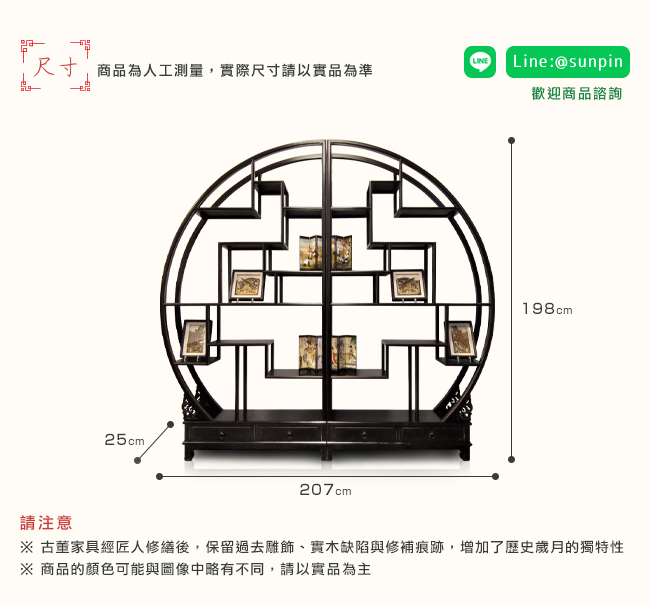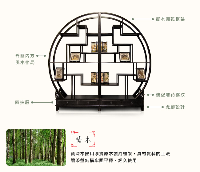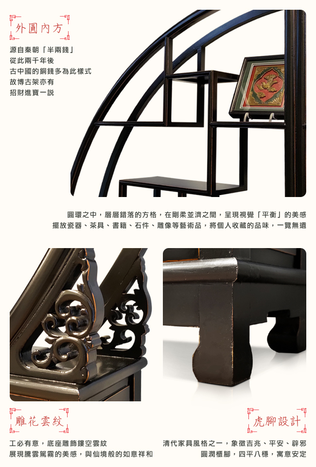 外圓內方的整體造型,源自秦朝「半兩錢」。從此兩千年後,古中國的銅錢多為此樣式,故博古架亦有招財進寶一說。圓環之中,層層錯落的方格,在剛柔並濟之間,呈現視覺「平衡」的美感。擺放瓷器、茶具、書籍、石件、雕像等藝術品,將個人收藏的品味,一覽無遺。工必有意,底座雕飾鏤空雲紋,展現騰雲駕霧的美感,與仙境般的如意祥和。