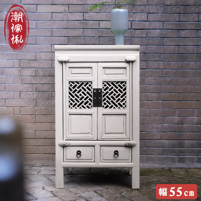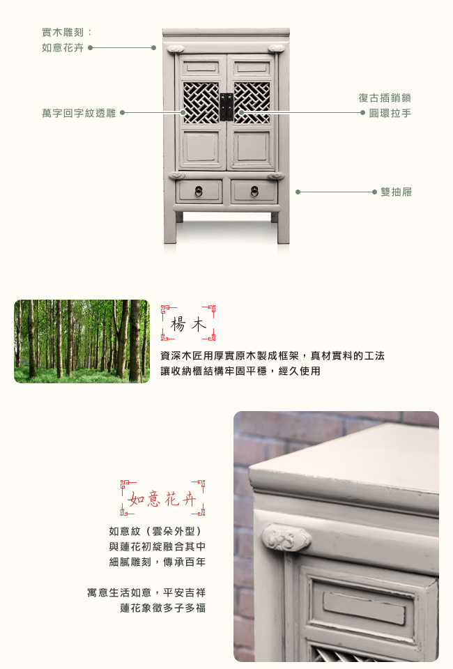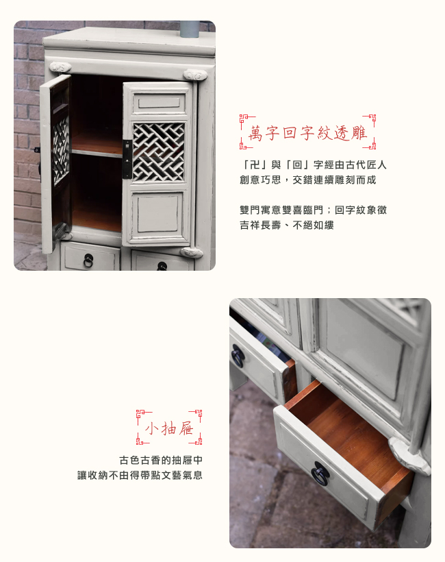 門板上的「如意花卉」,是如意紋(雲朵外型)與蓮花初綻融合其中,細膩雕刻,傳承百年。寓意生活如意,平安吉祥,蓮花象徵多子多福。萬字回字紋透雕。「卍」與「回」字經由古代匠人的創意巧思,交錯連續雕刻而成。雙門寓意雙喜臨門;回字紋象徵吉祥長壽、不絕如縷。