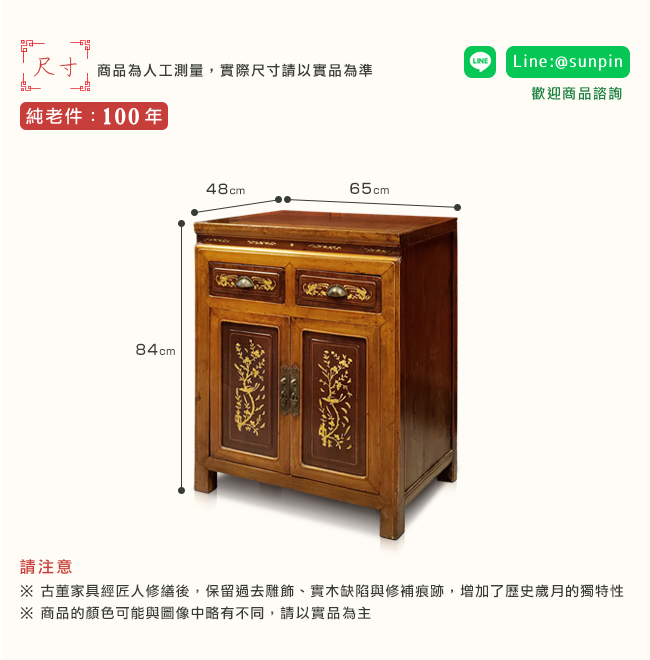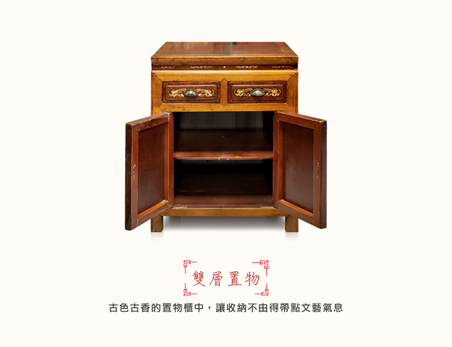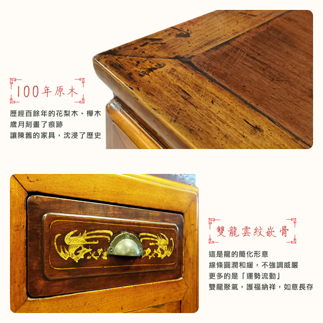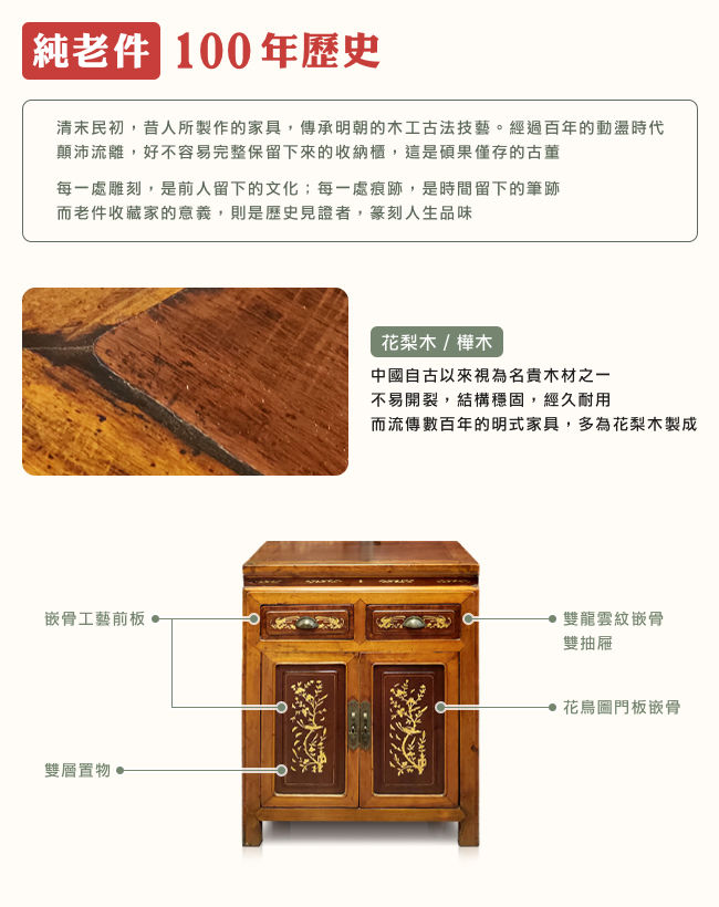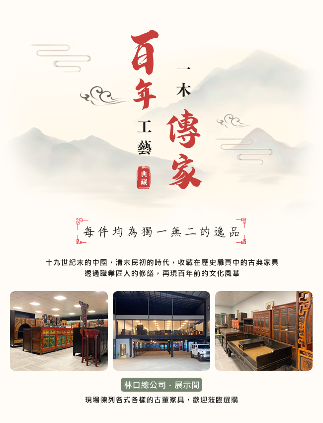 清末民初,昔人所製作的家具,傳承明朝的木工古法技藝。經過百年的動盪時代,顛沛流離,好不容易完整保留下來的收納櫃,這是碩果僅存的古董。每一處雕刻,是前人留下的文化;每一處痕跡,是時間留下的筆跡。而老件收藏家的意義,則是歷史見證者,篆刻人生品味。