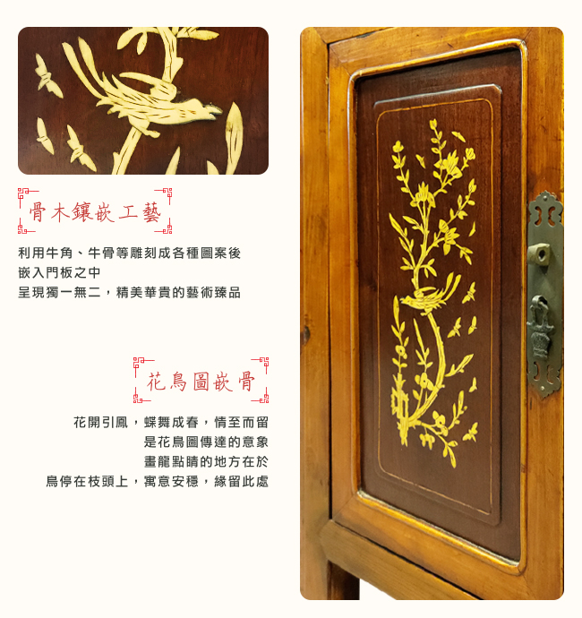 歷經百餘年的花梨木、樺木,在四季更迭中,歲月靜靜刻畫了痕跡,讓陳舊的家具,沈浸了歷史。「骨木鑲嵌工藝」利用牛角、牛骨等雕刻成各種圖案後,嵌入門板之中,呈現獨一無二,精美華貴的藝術臻品。「雙龍雲紋嵌骨」這是龍的簡化形意,線條圓潤和緩,不強調威嚴,更多的是「運勢流動」:雙龍聚氣,護福納祥,如意長存。「花鳥圖嵌骨」花開引鳳,蝶舞成春,情至而留。這是花鳥圖傳達的意象,而畫龍點睛的地方在於,鳥停在枝頭上,寓意安穩,緣留此處。